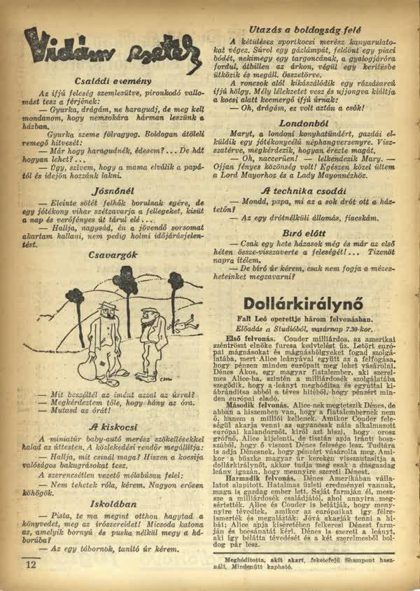 Viccek 1933-ból****A viccek sokat elárulnak az adott korról, de állandó elemek is fellehetők, mint amilyen a félműveltség, illetve a hivalkodás kigúnyolása, és az anyósok is elmaradhatatlan szereplők.