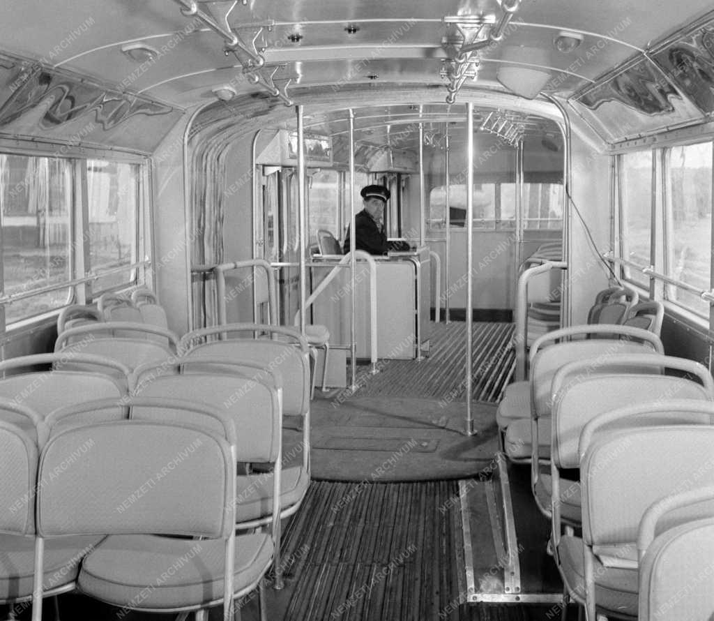 Az új csuklós autóbusz belső tere. A 7/c vonalán csuklós autóbuszt állítottak forgalomba. Az új kocsiban, amely 15 méter hosszú, 34 ülő- és 64 állóhely van, de csúcsterhelés esetén 160 személyt is szállíthat.