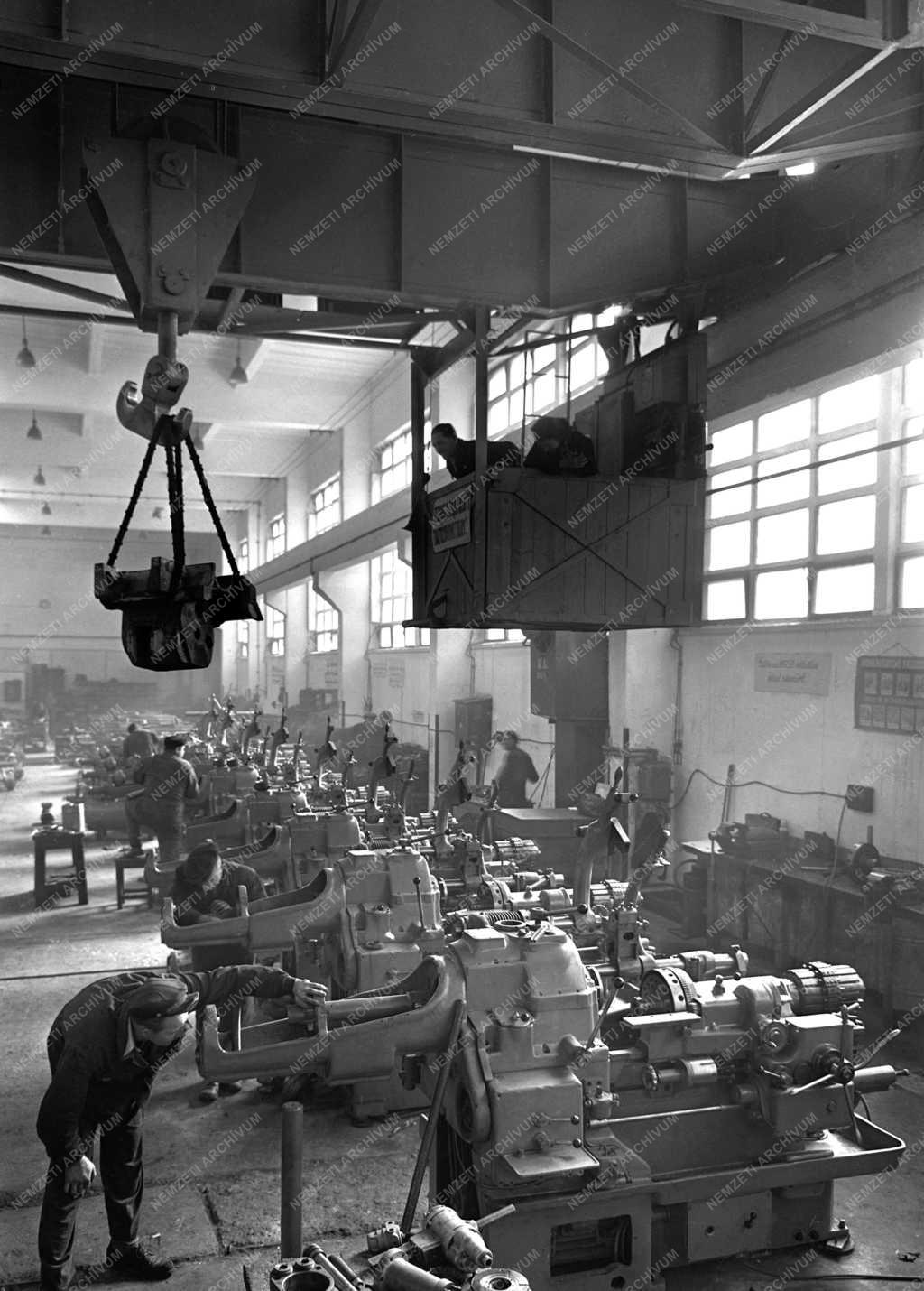 Marógépeket készítő munkások a Fémáru és Szerszámgépgyárban, középen az emelődarut vezérlőfülkéből irányító munkás.