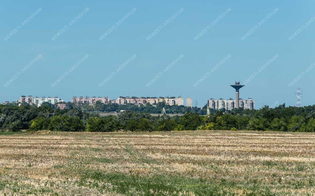 Dunaújváros, a Mezőföld keleti szélén található, a Duna jobb oldalán fekvő város látképe a víztorony és a Római városrész lakóépületeivel az 51-es főútról, Szalkszentmárton irányából nézve.