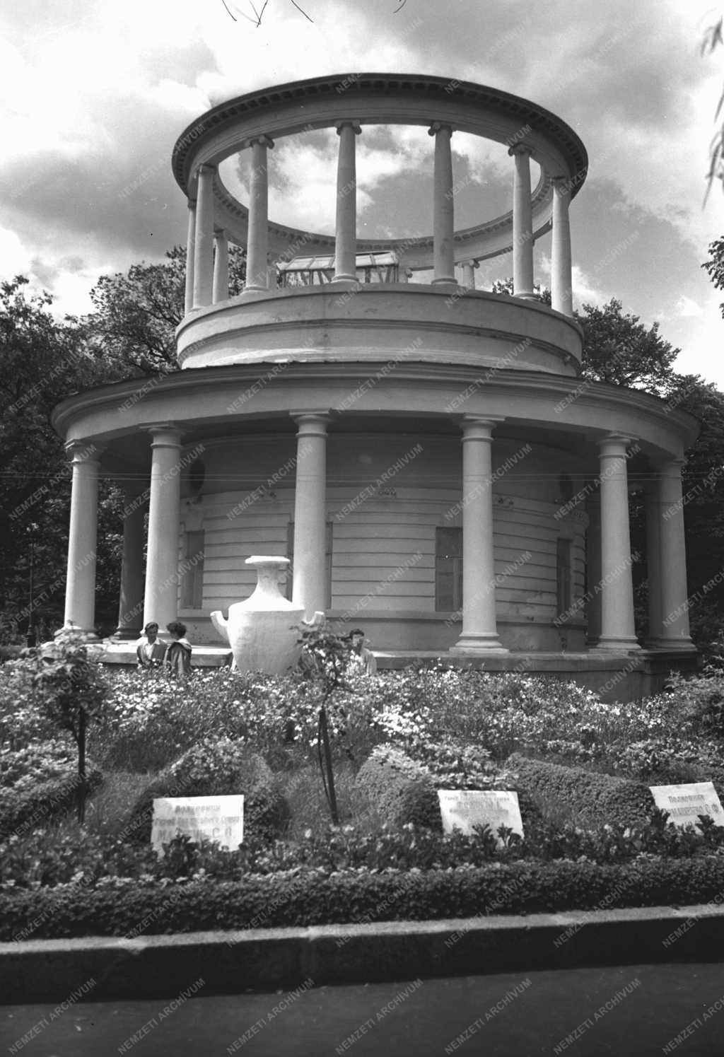 A Szovjetunióban kéthetes IBUSZ (Idegenforgalmi Beszerzési Utazási és Szállítási Vállalat) társasutazáson résztvevő magyar turisták a hősi halottak kertjében a honvédő háborúban elesett katonák sírjainál, a sírok mögött lévő körépület az orosz hercegek temetkezési helye volt.