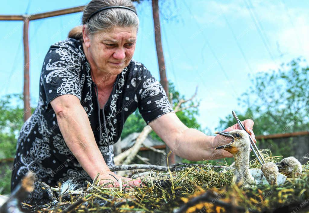 Berényi Tünde gondozó eteti a fiókákat. A Hortobágyi Madárkórház röpdéjében gyógyítás, ambuláns kezelések és rehabilitáció után földre rakott fészkeikben szaporodnak a fehér gólyák (Ciconia ciconia). Őszi vonulásuk előtt a szaporulatot egészséges társaik közzé engedik, így a telet már Afrikában töltik, csatlakozva a madárvonulás természetes rendjéhez. A szárnyaszegett gólyák után 15-20 egészséges fiatal madár kerül ki a a madárkórházból.