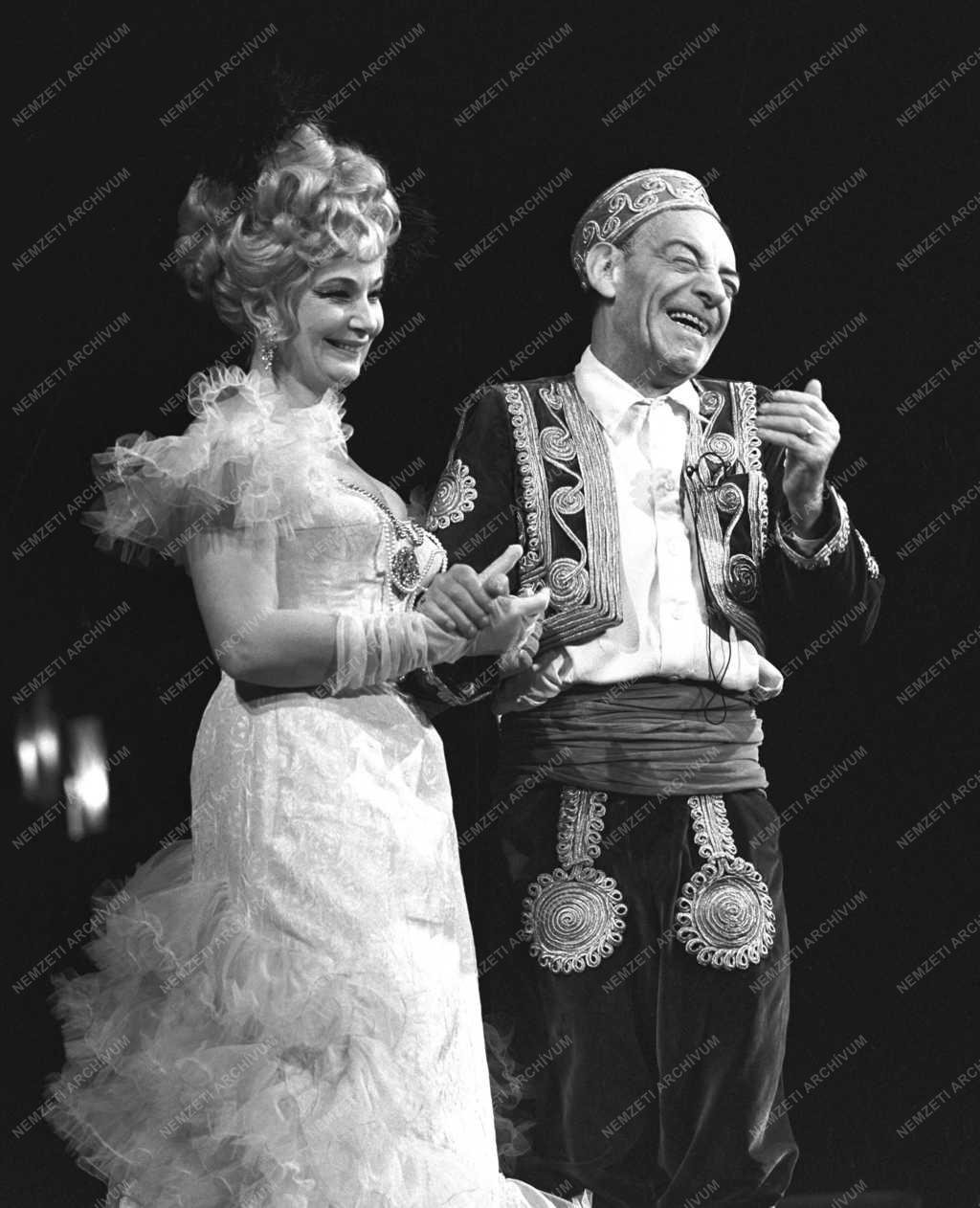 Petress Zsuzsa és Latabár Kálmán színészek játszanak Lehár: Víg özvegy című három felvonásos operettjének próbáján az Operett színházban. A darabot május 9-én mutatja be a Fővárosi Operett Színház Seregi László rendezésében.