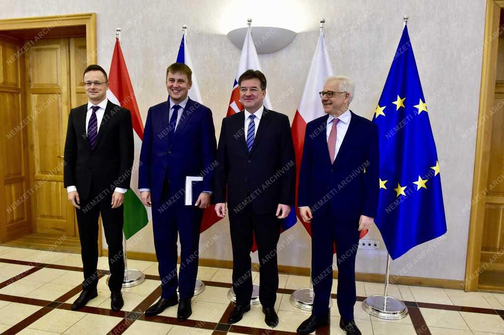 A Külgazdasági és Külügyminisztérium (KKM) által közreadott képen Szijjártó Péter külgazdasági és külügyminiszter, valamint Tomás Petrícek cseh, Miroslav Lajcák szlovák és Jacek Czaputowicz lengyel külügyminiszter (b-j) a visegrádi csoport külügyminisztereinek plenáris ülésén Pozsonyban 2018. november 29-én.