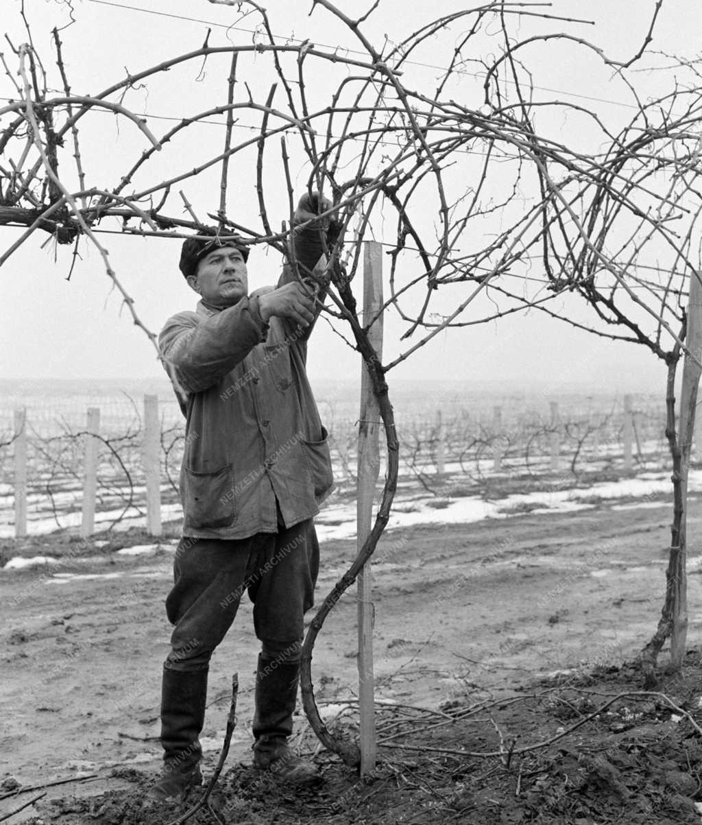 Gulyás Sándor, a Kamarás József vezette háromszoros szocialista brigád tagja metszi a szőlőt a Balatonboglári Állami Gazdaságban gyümölcsösében. Az eddig kimondottan tavaszinak minősített munka előrehozása, az eddigi tapasztalatok szerint nem árt a szőlőnek, viszont munkaszervezés és munkaerő gazdálkodás szempontjából viszont nagy előnyt jelent a gazdaságnak. Kétmillió szőlővesszőt is feldolgoznak oltványkészítéshez a gazdaság dolgozói, amelyből másfélmilliót saját céljaikra használnak fel.