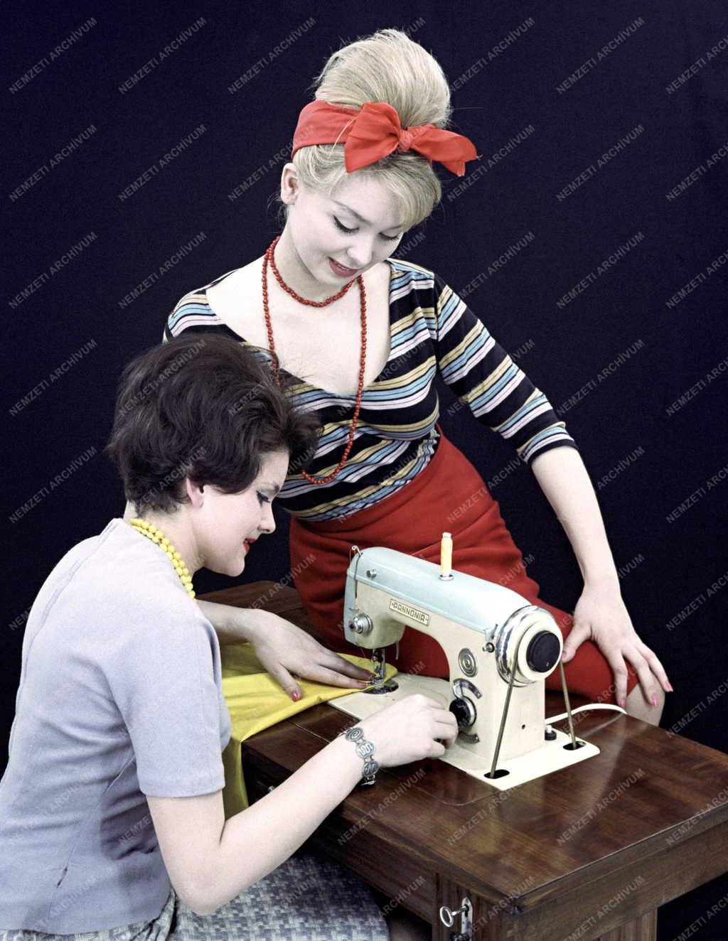 Manökenek a Csepeli Kerékpár és Varrógép Gyár Pannónia típusú állványos varrógépét reklámozzák a műtermi fotón.