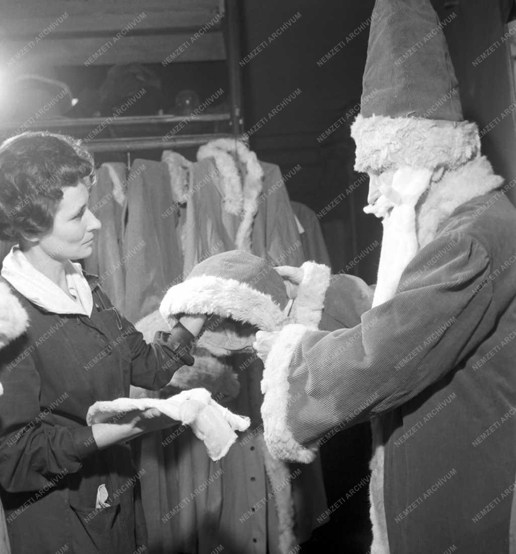 Aufenberg Ferencné a Jelmezkölcsönző Vállalat jelmeztár kezelője a Mikulás jelmez kellékeit mutatja egy férfinak. A vállalatnál már előkészítik, próbálják és méretre igazítják a Télapó és krampusz jelmezeket, amelyeket december elsjétő lehet kölcsönvenni a belvárosi Bécsi utcai üzletben.