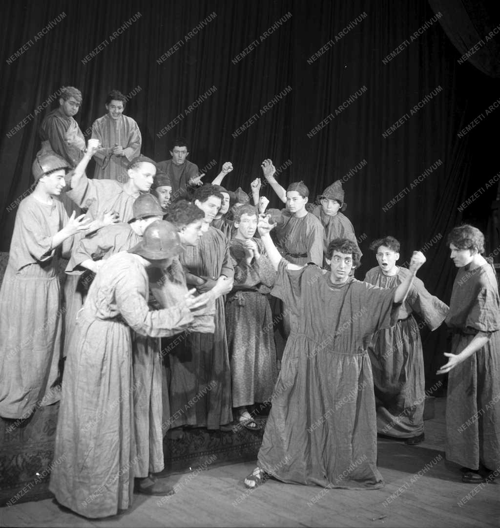 Balogh Géza IV. osztályos tanuló (k, Ádám) Madách Imre „Az ember tragédiája” című színműve egyik jelenetében a Zeneakadémia kistermében, a Madách Imre Gimnázium színjátszókörének előadásán.