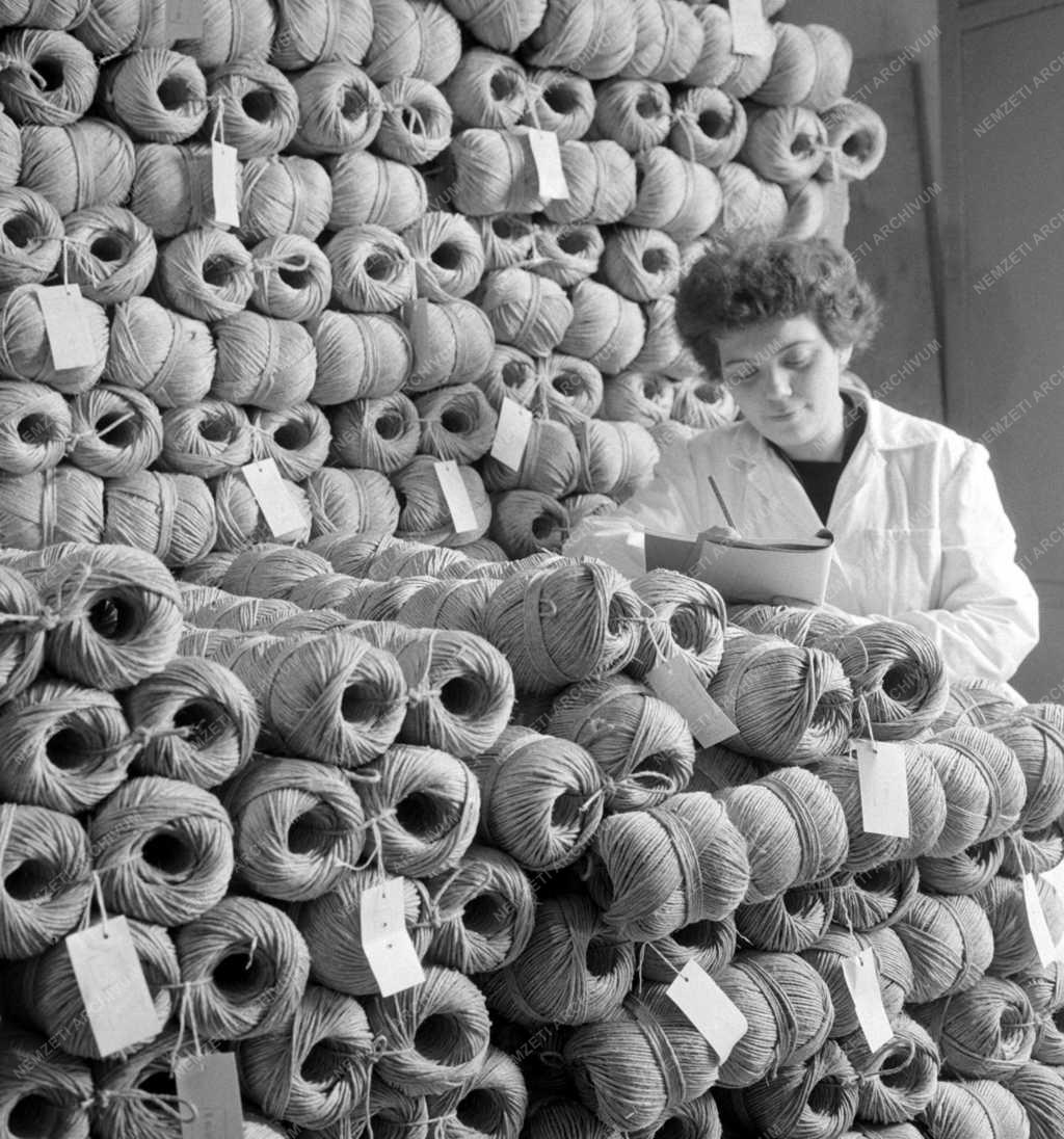 Benedek Ágostonné, a január 1-től üzemelő Budapesti Agroker mezőgazdasági ellátóvállalat dolgozója szállításra készíti elő a Komárom megyei termelőszövetkezetek (Tsz) gombolyag zsineg rendelését a vállalat len-kender raktárában.