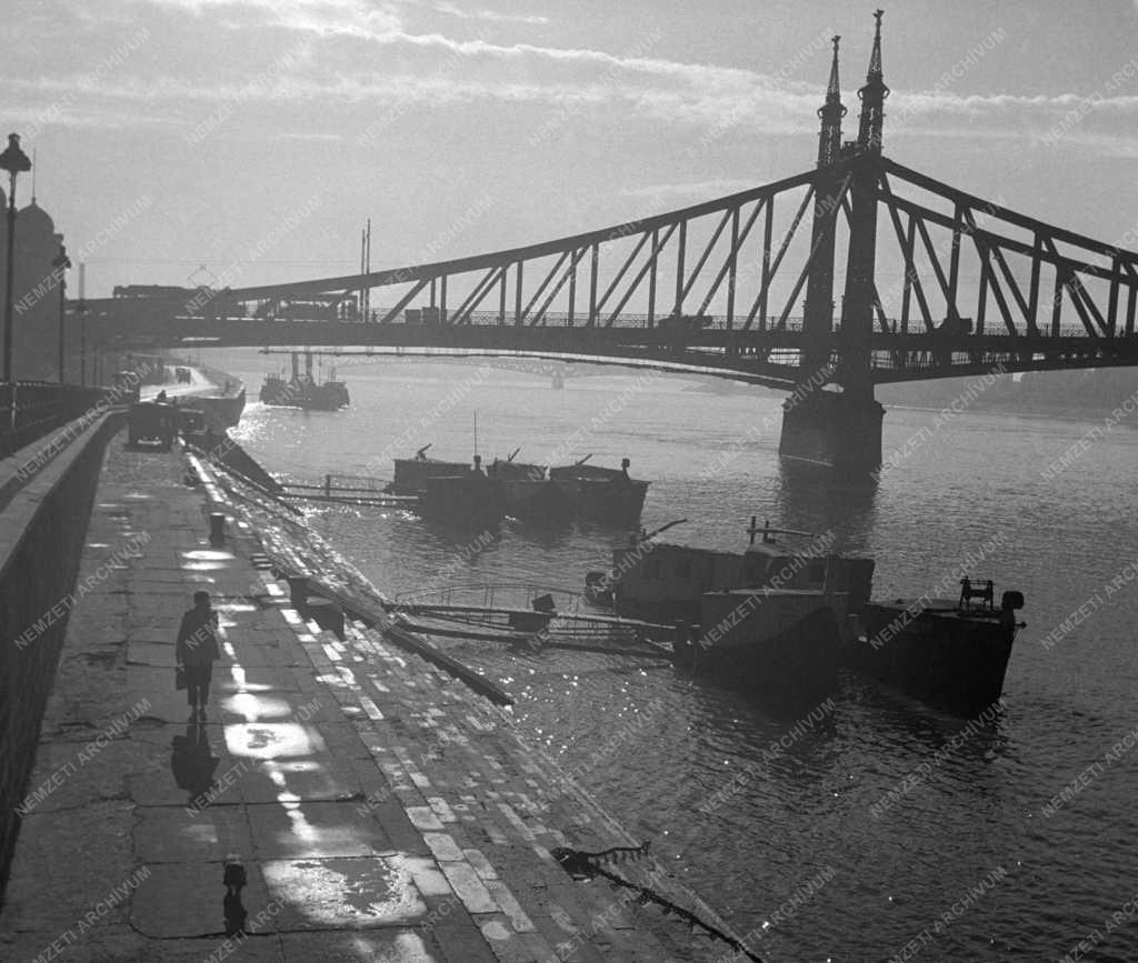 Kikötőpontonoknál várakozó dunai hajók a pesti alsó rakpartnál, háttérben a Szabadság híd részlete.