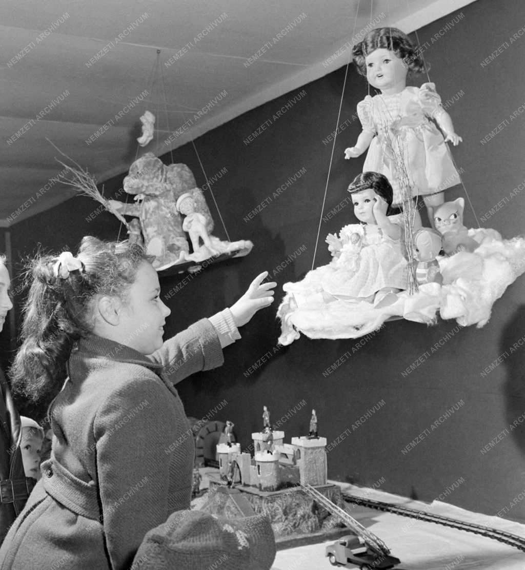 Gyerekek nézik a kiállított babákat és játékokat egy kiállításon.