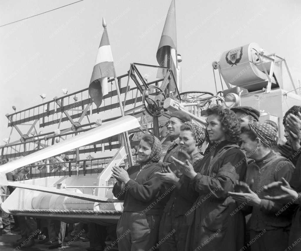 Dolgozók tapsolnak az angyalföldi Első Magyar Gazdasági Gépgyár (EMAG) udvarán rendezett ünnepségen, ahol a gyár igazgatója átadja a legyártott tízezredik kombájnt a csehszlovák megrendelők megbízottjának a budapesti csehszlovák nagykövetség kereskedelmi tanácsosának.