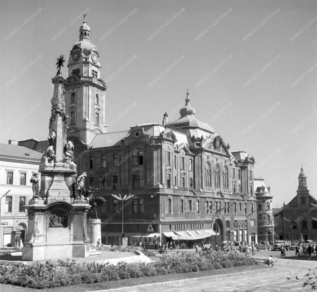A pécsi Széchenyi tér a Szentháromság-szoborral és a Városháza épületével.