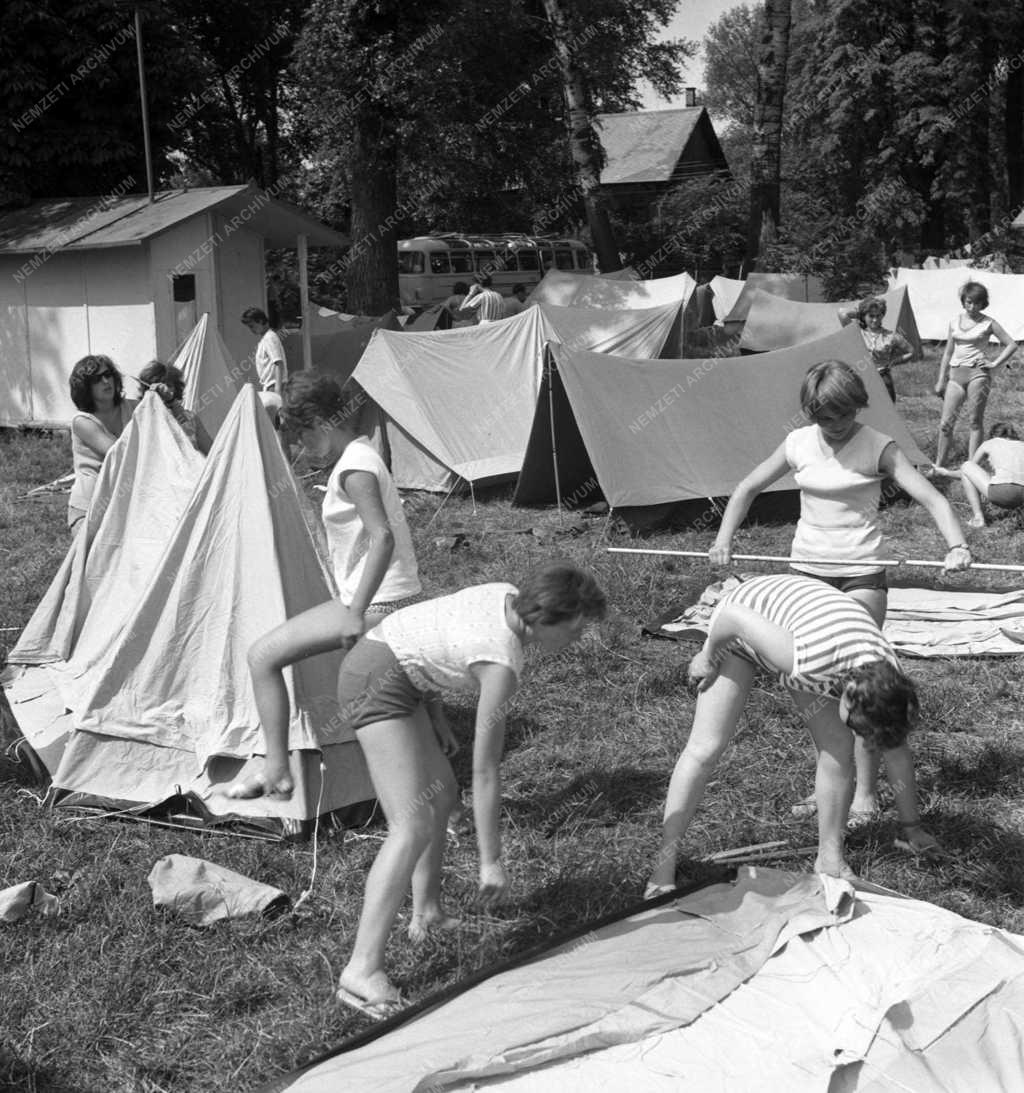 Cseh diáklányok sátrat építenek a római-parti autós kempingben.