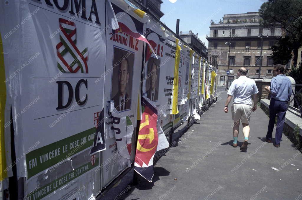 A Kereszténydemokrata Párt (Democrazia Cristiana – DC) választási plakátja más plakátok közt egy római utcán. A felvétel készítésének pontos dátuma ismeretlen.