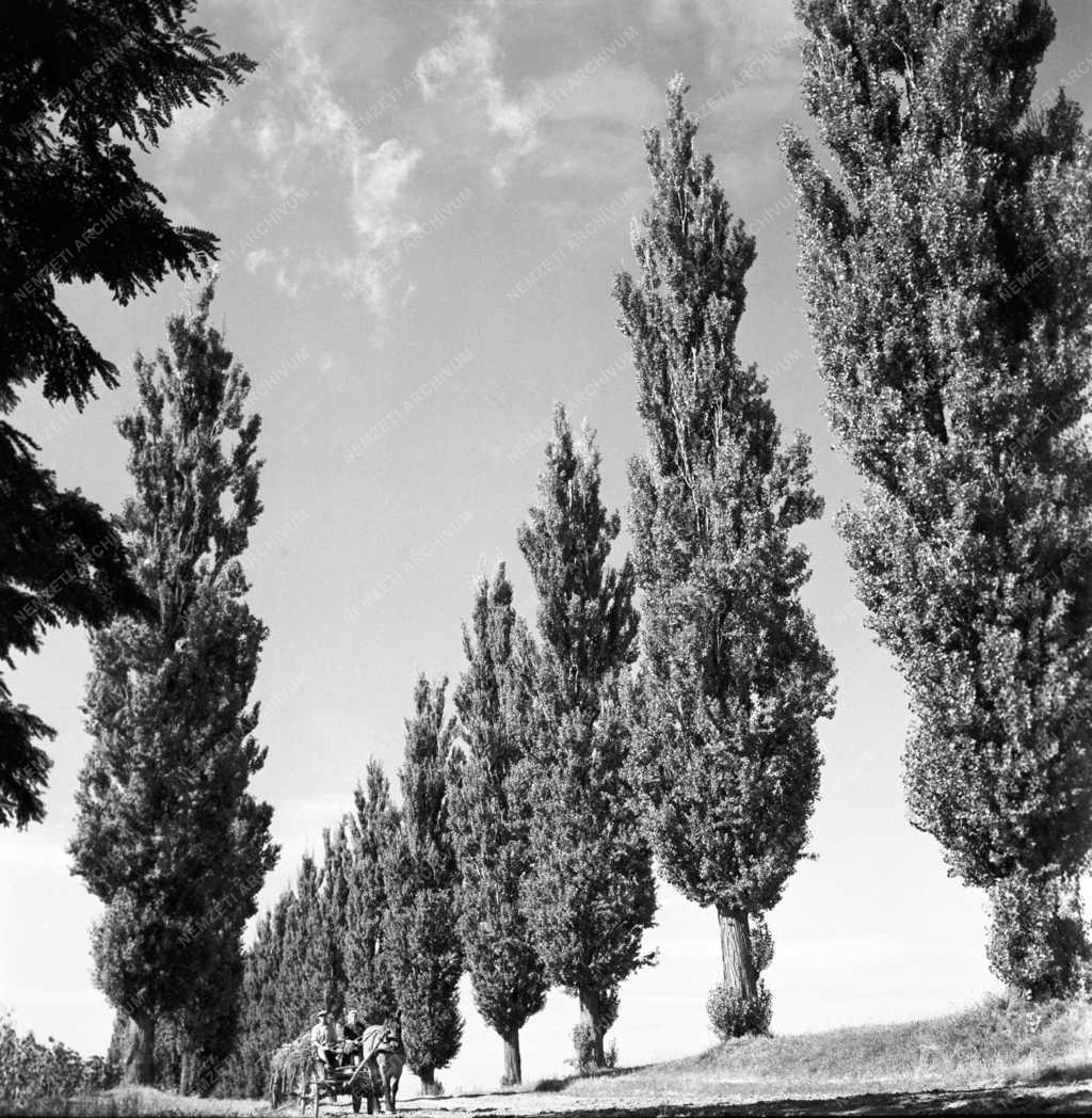 Szénásszekér halad egy nyárfák szegélyezte úton.
