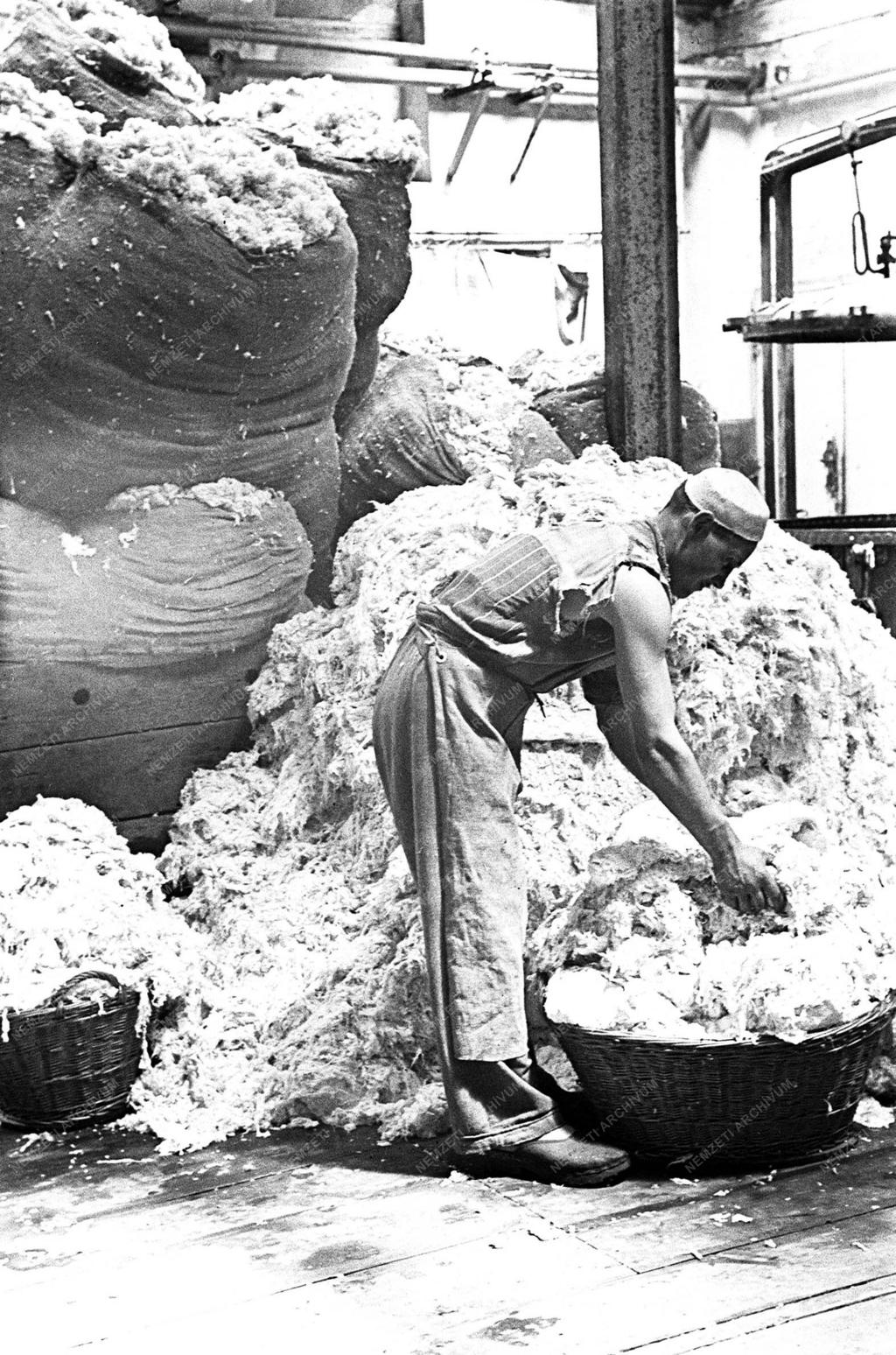 Egy férfi gyapotbálánál dolgozik a Rico Magyar Kötszerművek Váci úti gyárának anyagraktárában.
