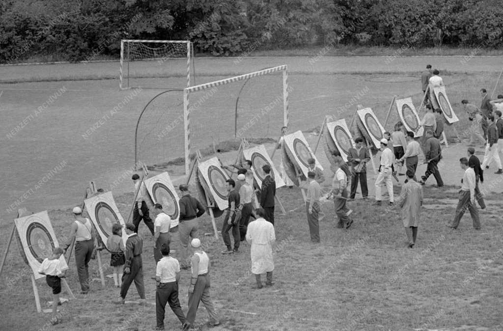 A versenyzők eredményeiket ellenőrzik a céltábláknál a Margitszigeti Úttörő Stadionban rendezett Országos Íjászbajnokságon.