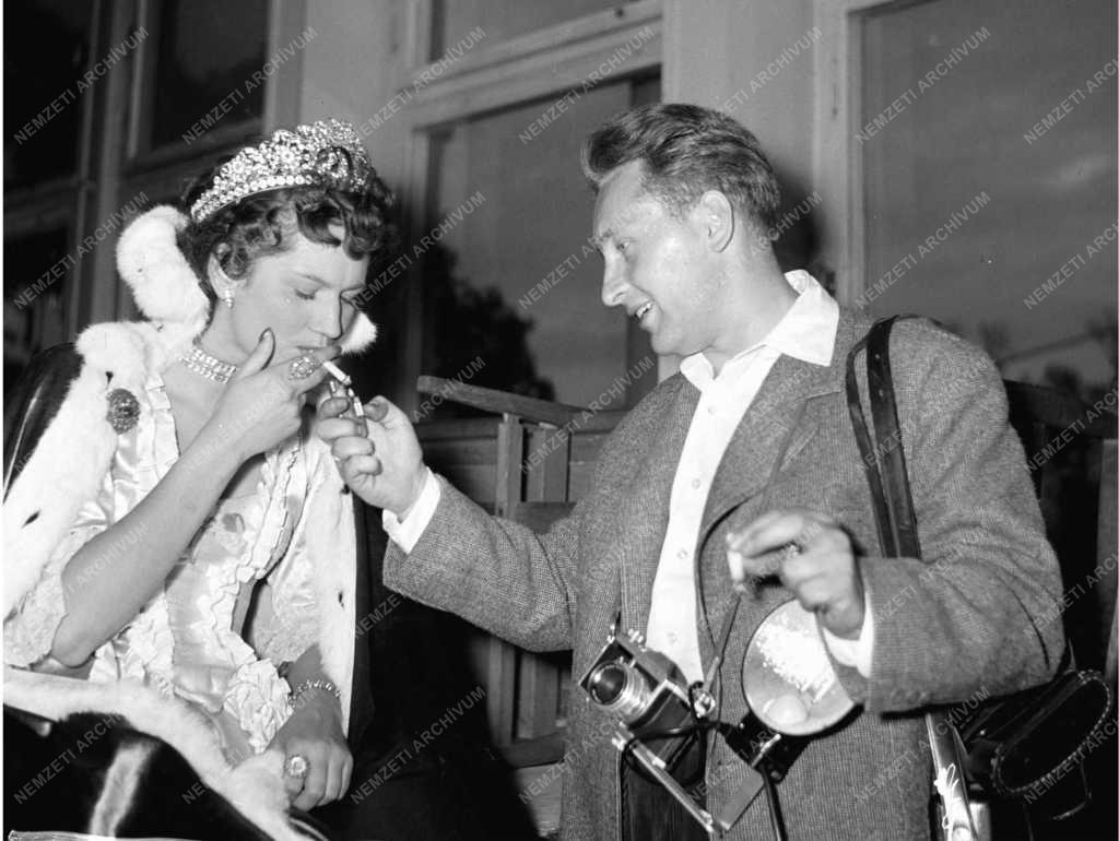 A Dolgozó Ifjúság Szövetségének karneválja a Felvonulási téren, ahol a karnevál hercege Kabos László, a hercegnő pedig Sturcz Edit (cigarettával) volt.