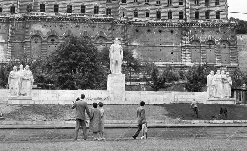 Járókelők nézik az augusztus 20-án felavatandó Dózsa György-szobrot, Kiss István szobrászművész alkotását. A szobor körül még folynak a parkosítási munkák. A háttérben a még helyreállításra váró Budavári Palota.