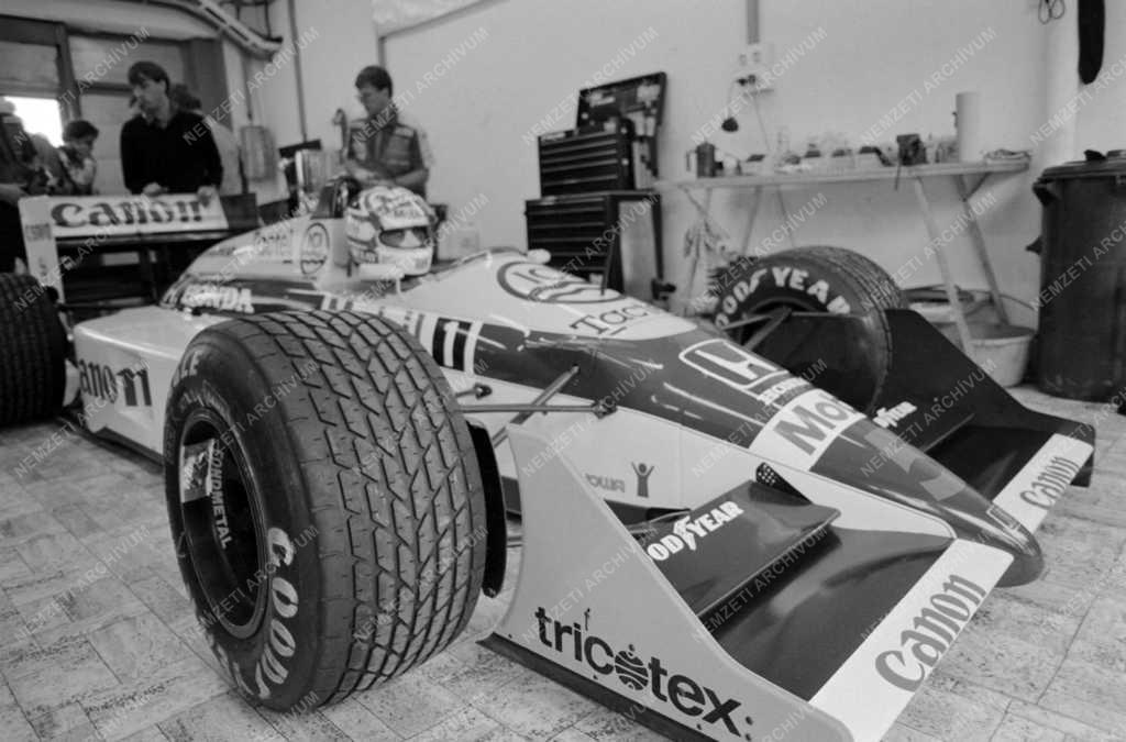 Indulásra készen várakozik Nigel Mansell (angol, Williams-Honda) kocsijában a Forma 1-es világbajnokság II. Magyar Nagydíjának első edzésnapján. Mansell a legjobb edzésidővel az élről indult a versenyen.