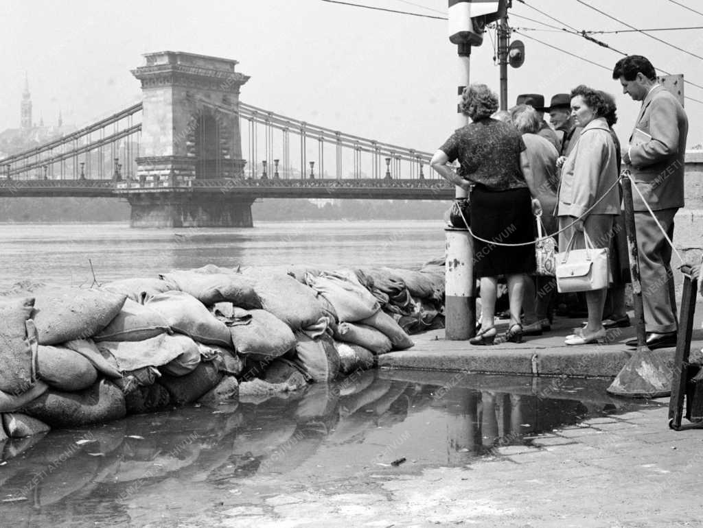 Érdeklődők, katasztrófa turisták nézik a megáradt Duna folyó által elöntött pesti alsó rakpartot a Lánchíd közelében.