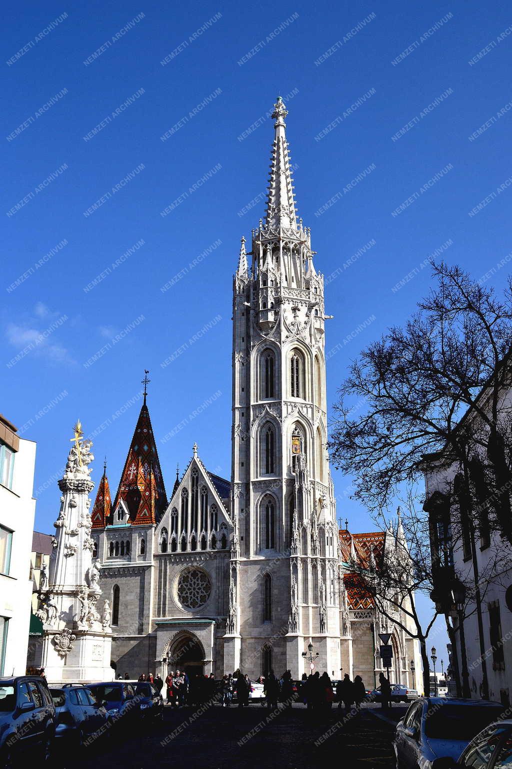 Megújult a Mátyás-templom homlokzata, balra a Szentháromság-szobor. A főváros kiemelt szakrális épületeinek egyikét a rekonstrukció során szó szerint a pincétől a padlásig felújítják. Jelenleg a belső tér rekonstrukciója folyik, a munkálatokat várhatóan 2013. tavaszán fejezik be.