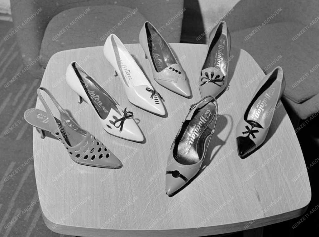 1965-ös cipőmodellek a Balaton Cipőkészítő Kisipari Termelő Szövetkezet próbatermében. A KTSZ korszerű üzemében új szalagon gyártják a legújabb női cipőmodelleket.