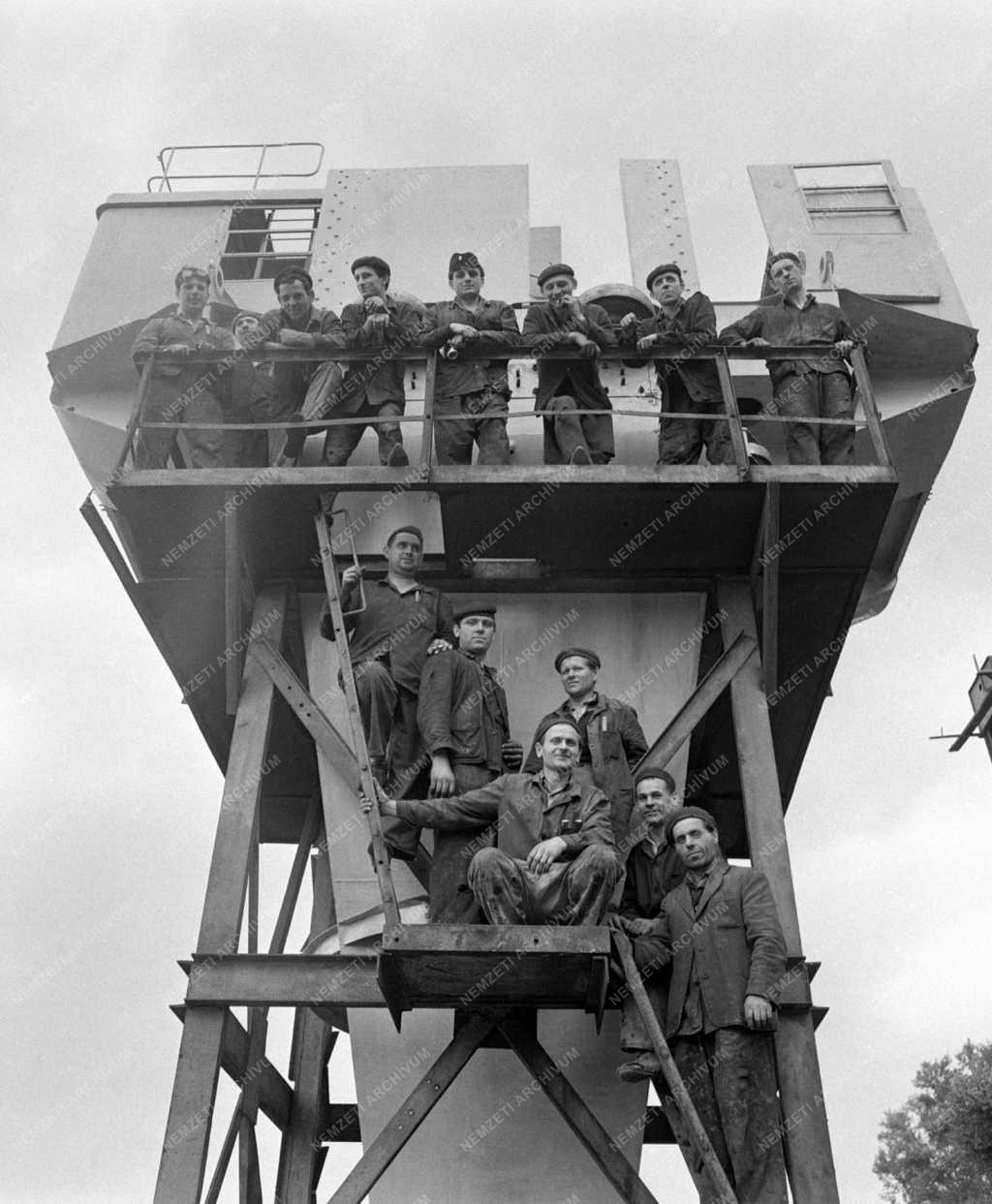 A Kilián György négyszeres Szocialista Brigád elismerő címmel kitüntetett szerelőbrigád tagjai, a Duna folyó árvize okozta kényszerpihenő ellenére a szovjet megrendelésre határidőre elkészült idei 44. öttonnás, 30 méter gémnyílású darun - ebből a típusból a négyszázadik - a jubileum alkalmából tartott házi ünnepségen, a Magyar Hajó- és Darugyár Angyalföldi Gyáregységében.
