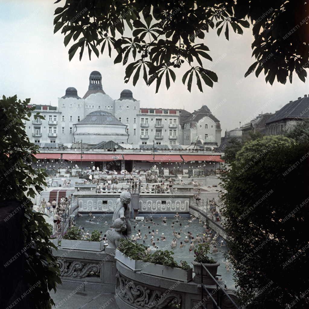 Strandolók fürdenek a Gellért Gyógyfürdő hullámmedencéjében. Előtérben Telcs Ede Gyermekfigurák szobra, háttérben a Gellért Szálloda épülete.