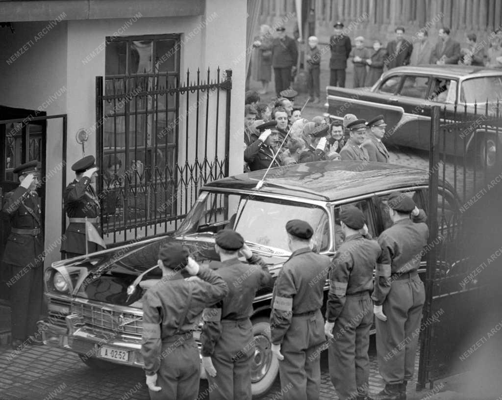 Egyenruhás iparőrök tisztelegnek az Egyesült Izzó gyárának bejáratánál, mikor megérkeznek a szovjet szovjet párt- és kormányküldöttség autói. Nyikita Szergejevics Hruscsov, a Szovjetunió Kommunista Pártja Központi Bizottságának (SZKP KB) első titkára, a szovjet párt- és kormányküldöttség vezetője és a küldöttség a Magyar Szocialista Munkáspárt Központi Bizottsága és a forradalmi munkás-paraszt kormány meghívására látogatott Budapestre.