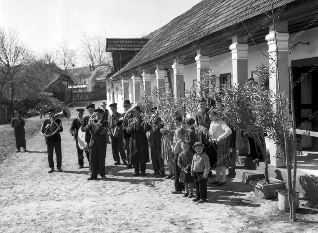 A rezesbanda zenés ébresztőt játszik Szabó János nyolcholdas gazda portáján.