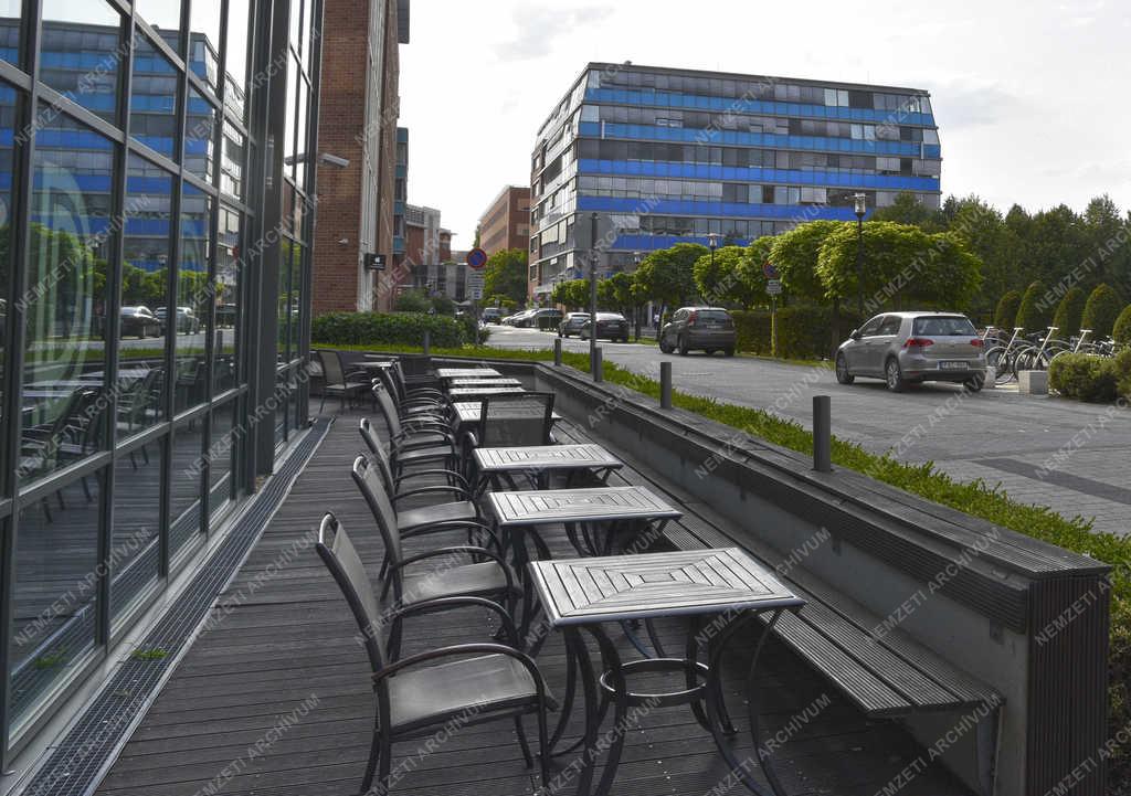 Pihenő és étkezőasztalok az egyik irodaház előtt, háttérben az "I" épület. Az Infopark Kelet-Közép- Európa első innovációs és technológiai parkja Újbudán a Rákóczi hídtól északra.