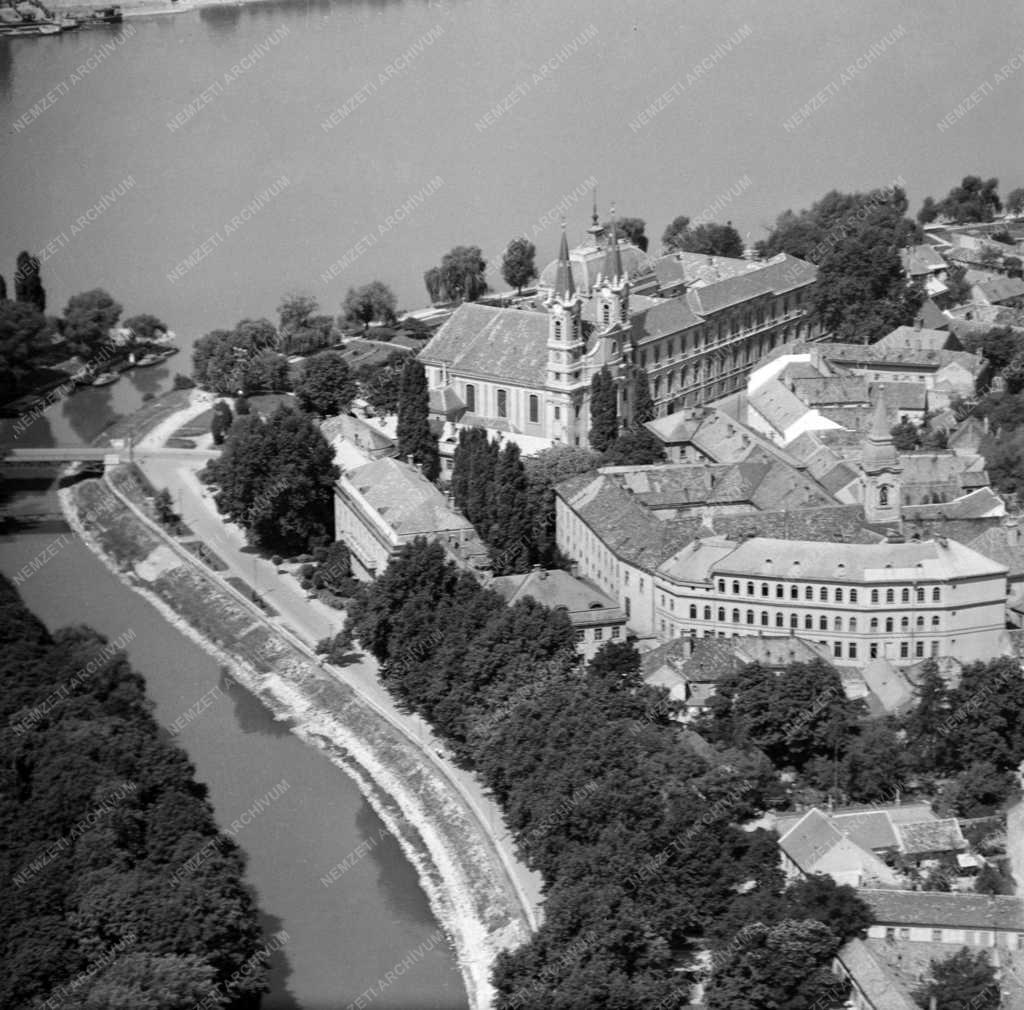Esztergomi városkép: a Szent Ignác-plébániatemplom a vízivárosban, mellette jobbra a prímási palota épülete.