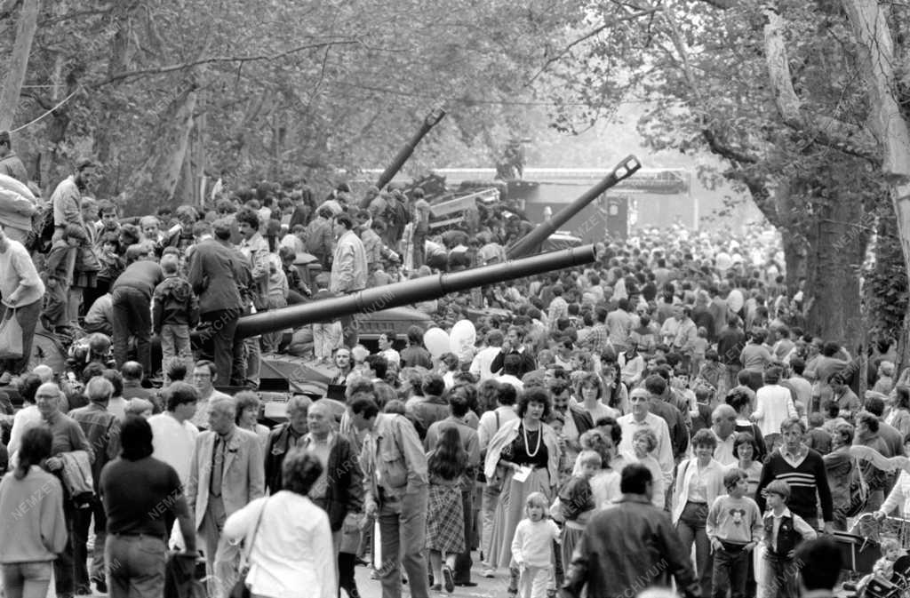Az érdeklődők tömege, közöttük gyermekek keresik fel a fegyveres erők napja rendezvényét a Városligetben, ahol harci eszközöket – közöttük az előtérben egy T-55-ös harckocsi - mutatnak be.