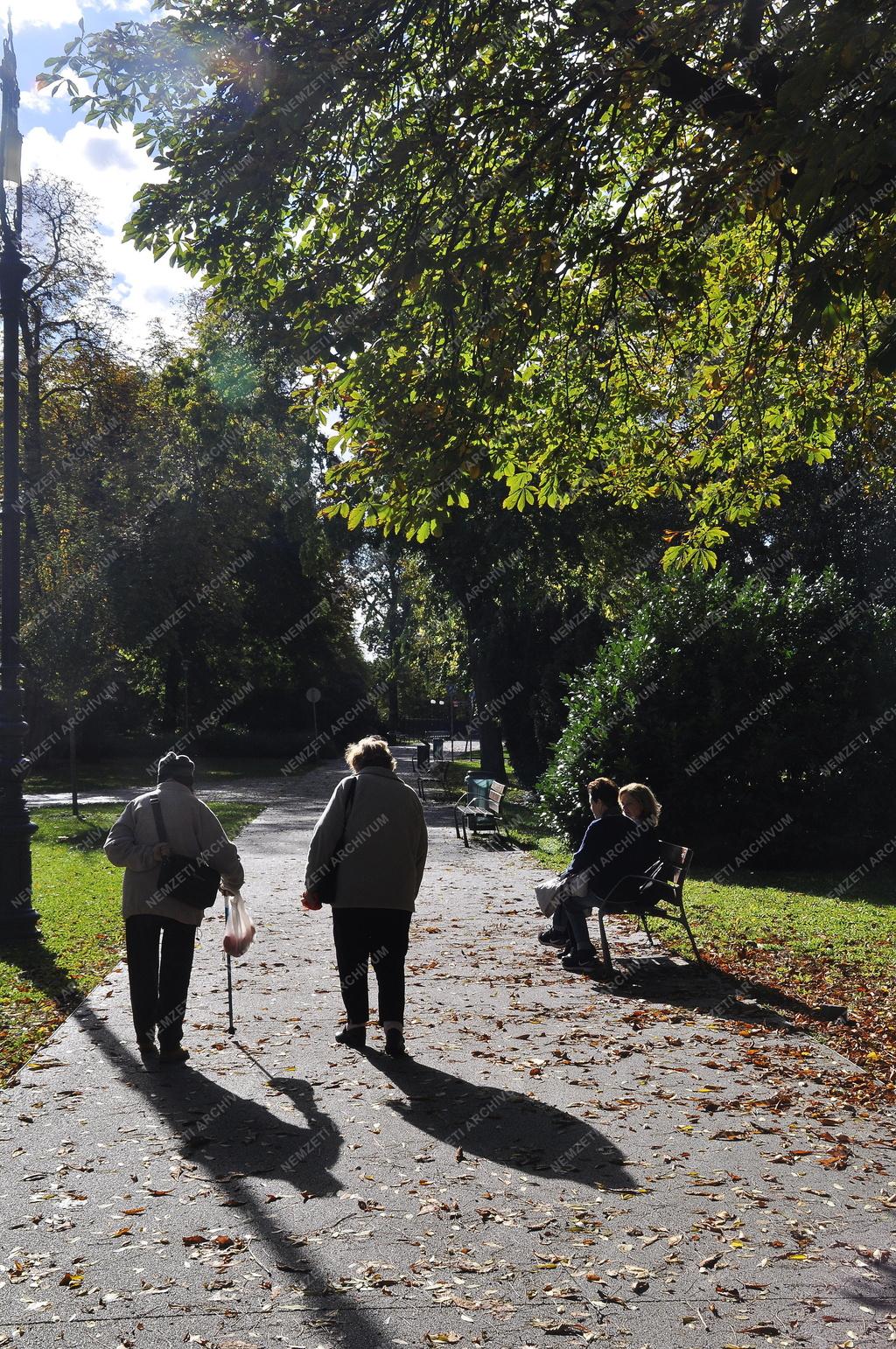 Idős nők sétálnak az őszi napsütéses időben a Margit-szigeten.