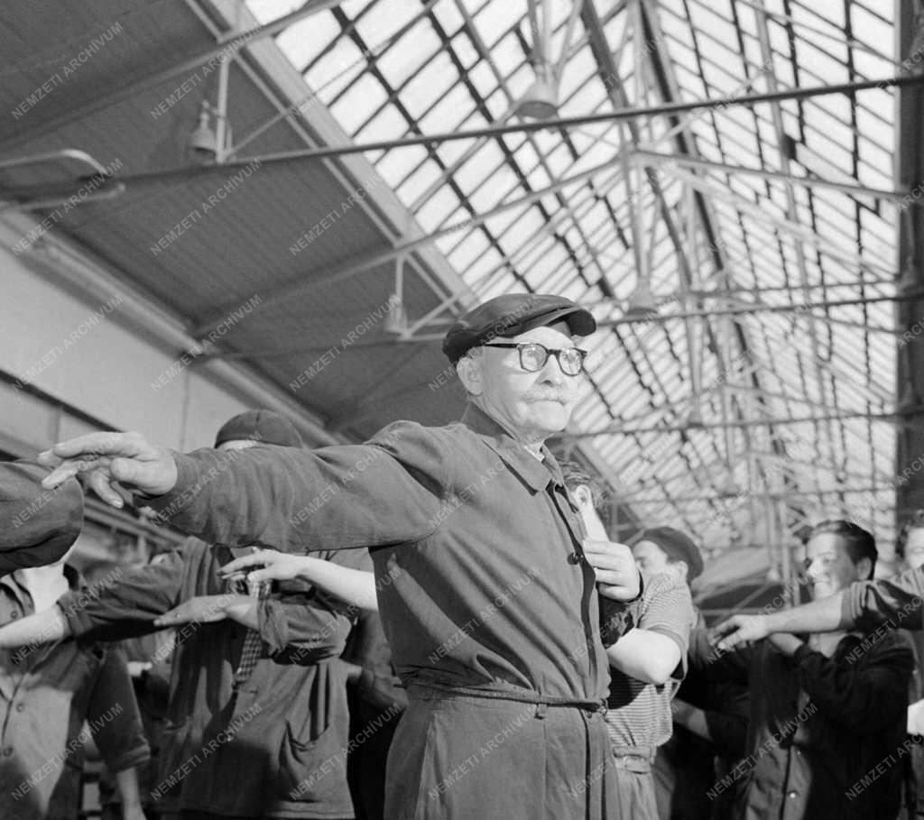 A Ganz-Mávag Gyár idős munkása tornagyakorlatot végez munkaközi szünetben a szerszámüzemben, ahol elsők között vezettek be a „Tevékeny pihenőt”, amelyben öregek-fiatalok, értelmiségi és fizikai dolgozók egyaránt résztvesznek