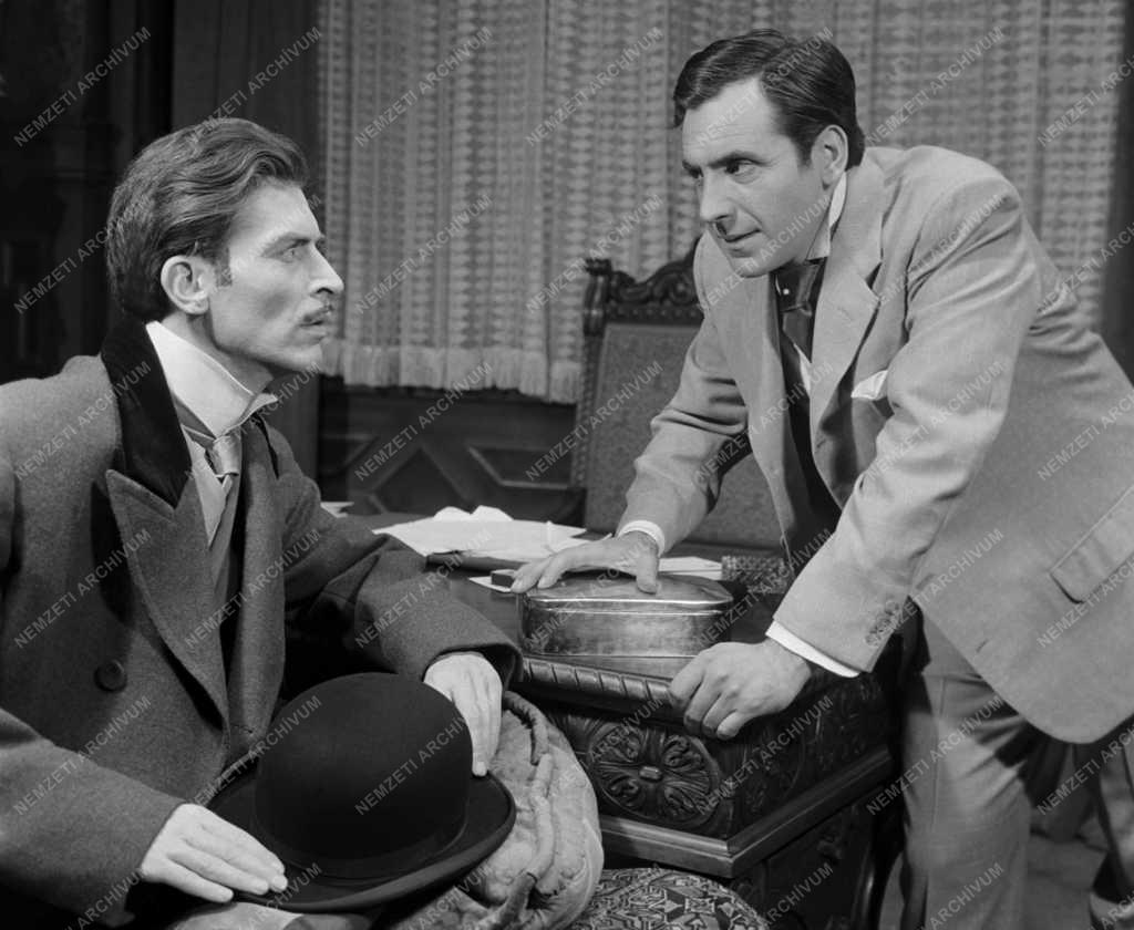 Keres Emil Müller és Pálos György Barna Gábor, osztályvezető szerepében (b-j) Földes Imre Hivatalnok urak című művének próbáján. A színművet 1959. október 9-én mutatja be Kazimir Károly rendezésében a Magyar Néphadsereg Színháza.