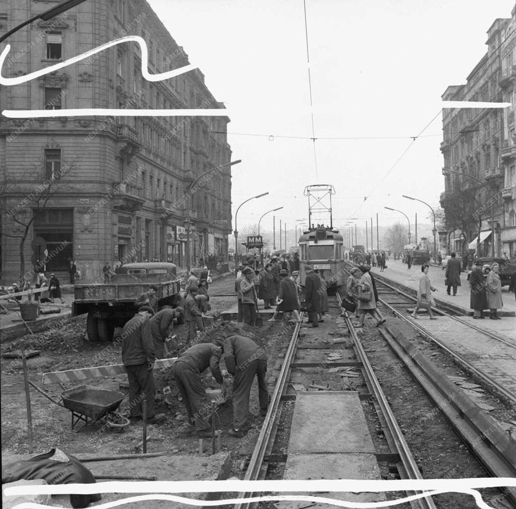 Az északi oldalon és a Nyugati pályaudvarnál megkezdték a csatornázási munkálatokat. A háttal látható tehergépkocsi egy ZISZ MMZ 585-ös "billencs", az ötvenes-hatvanas évek építkezéseinek egyik főszereplője.