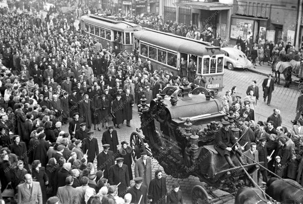 Gyászolók sokasága kíséri végső nyughelyére, a Kerepesi temetőbe a november 10-én elhunyt Somlay Artúr színész gyászkocsira helyezett koporsóját a Rákóczi úton.