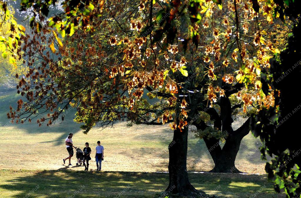 Fővárosi fiatalok sétálnak nyáriasan meleg napsütésben a Tabán közparkjának sárguló levelű fái alatt.