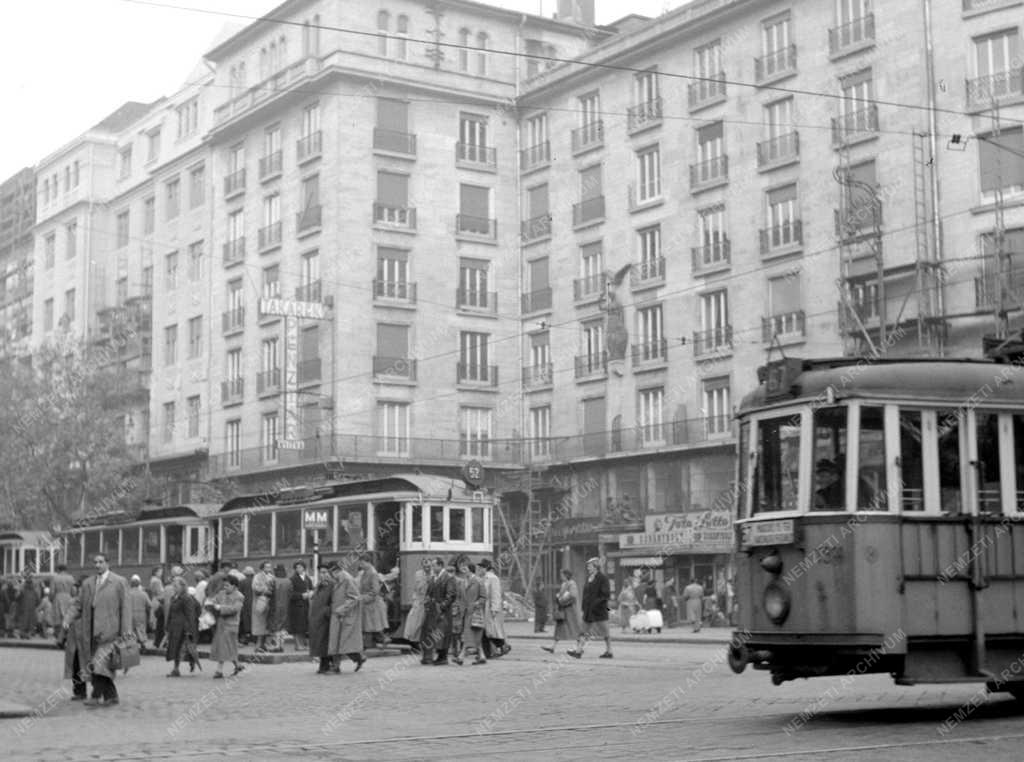 Utasok szállnak le és fel az 52-es villamosról az Astoriánál, a Rákóczi út és a Tanács körút kereszteződésében, előtérben a 67-es villamos.