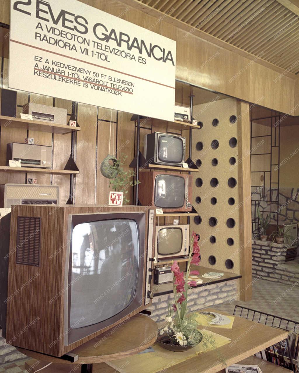 Televízió -és rádiókészülékek a székesfehérvári Videoton Rádió- és Televíziógyár szegedi mintaboltjában, szaküzletében. Előtérben, balra egy VT TC 684-OC OLYMPIA típusú televíziós készülék.