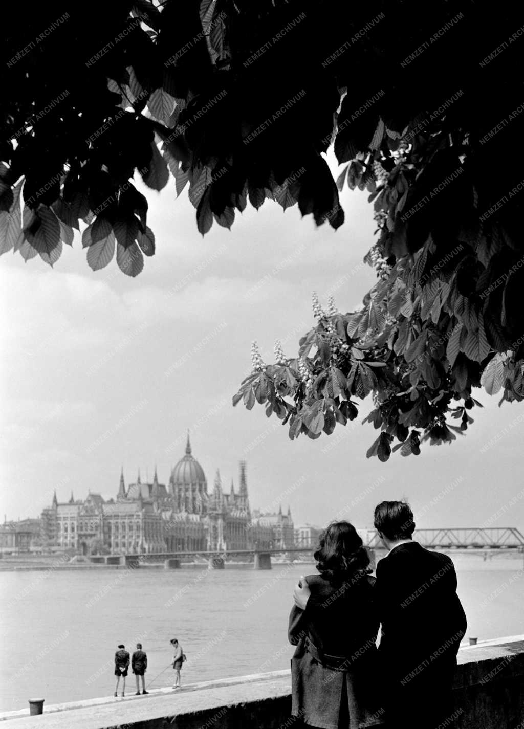Fiatal pár áll a budai Duna-parton egy gesztenyefa alatt. A háttérben (szemben) a Parlament épülete és a Dunán átívelő Kossuth híd.
