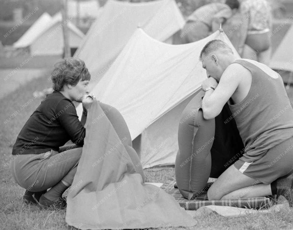 Fújja a gumimatracokba a levegőt egy újonnan érkezett pár a római-parti kempingben.