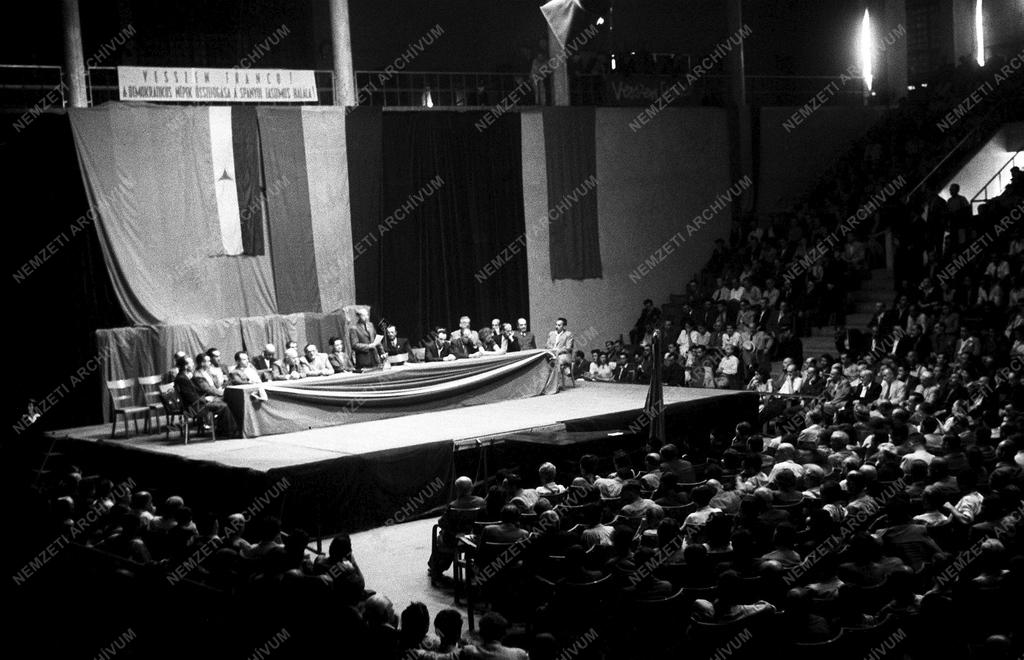 Kisházi Ödön, a Szakszervezetek Országos Tanácsának (SZOT) elnöke mond beszédet a Francisco Franco spanyol tábornok diktatúrája ellen tiltakozó nagygyűlésen. A SZOT szervezésében a Sportcsarnokban tartott rendezvényen részt vett (az asztal bal szélétől) Farkas Mihály, a Magyar Kommunista Párt Politikai Bizottságának tagja (b1), Rákosi Mátyás államminiszter (b2), Szakasits Árpád államminiszter (b3), Piros László, a Szakszervezeti Tanács főtitkár-helyettese (b4), és Rajk László belügyminiszter, a Spanyolországi Magyar Önkéntesek Szövetségének elnöke (b6).