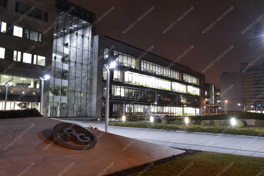 A Richter Gedeon Nyrt. Gyógyszergyár kémiai kutatólaboratóriuma esti kivilágításban a főváros X. kerületében, a Gyömrői úton.