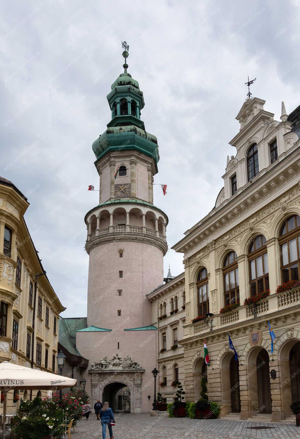 A város jelképe, a középkori alapokra a XVII. században épült Tűztorony, balra a Storno-ház barokk műemlék épülete, jobbra pedig a Városháza eklektikus stílusú műemlék épülete.