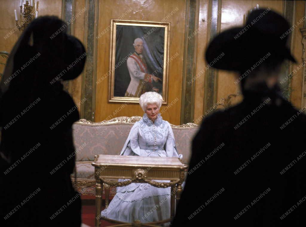 A főhercegnő szerepében Máthé Erzsi (k) kanapén ül a Különös házasság című tv film egyik jelenetében.