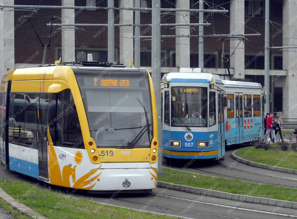 A Debreceni Közlekedési Zrt. (DKV) két villamosvonalán közlekedő szerelvények a Nagyállomásnál lévő végállomásukon. A 2-es vonalon CAF Urbos 3 (b) típusú villamosok járnak a Doberdó utca felé, az 1-es vonalon pedig a Magyarországon gyártott Ganz KCSV–6 (j) az Egyetem felé.